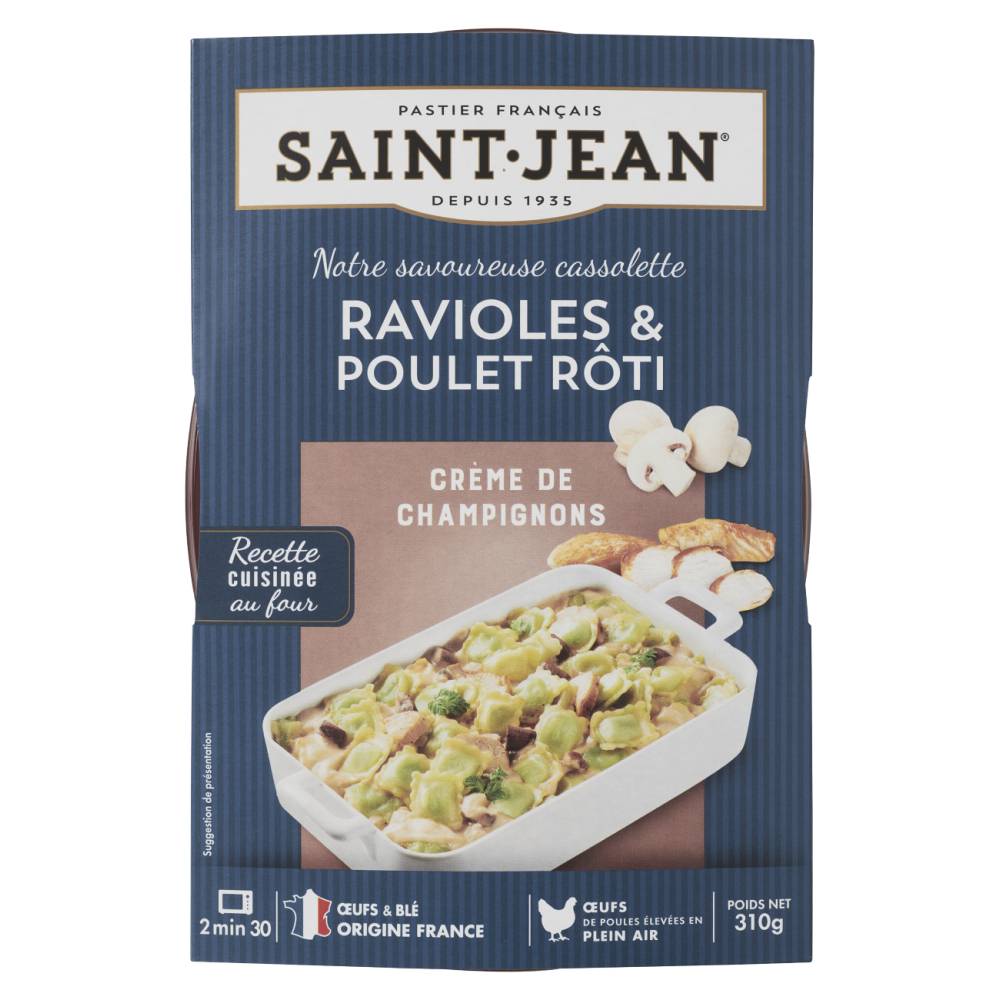 Ravioles, poulet rôti et champignons : un trio terroir gagnant que nous avons cuisinée au four, pour vous garantir un maximum de plaisir ! Un plat simple et délicieux, prêt en 2min30 aux micro-ondes. Avec des ravioles : Fabriquées avec des oeufs de poules élevées en plein air origine France Du blé origine FranceLe tout dans un emballage créé à partir de 80% de matériaux recyclés !