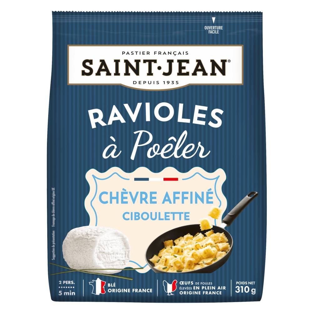 Ravioles à poêler au chèvre affiné ciboulette - 310g En apéro dînatoire, en salade ou en accompagnement de plats, les ravioles à poêler représentent une source d'inspiration sans fin. Si l'on ajoute qu'elles sont composées d'ingrédients sélectionnés avec soin (des oeufs de poules élevées en plein air origine France, du blé français) et que chacune de ces recettes vous offre le terroir sur un plateau (ou plutôt dans la poêle), on en conclut qu'il serait bien dommage de s'en priver ! Et tout ça : sans arôme, sans colorant, sans conservateur dans la recette. A conserver entre 0°C et +4°C. A consommer dans les 24h après ouverture.